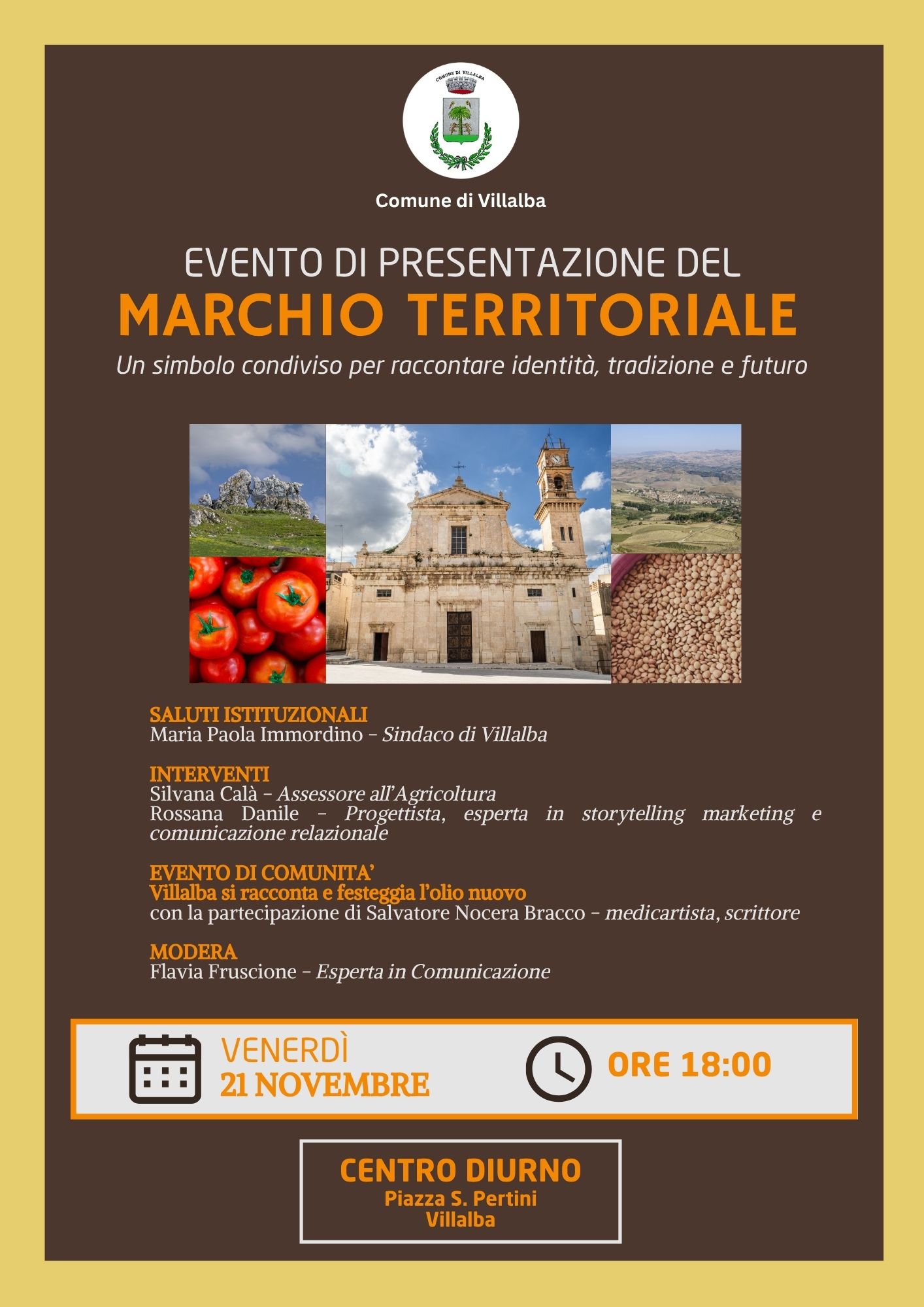 Il Comune di Villalba invita cittadini, imprese, associazioni e stampa all’evento di presentazione del Marchio Territoriale di Villalba, che si terrà venerdì 21 novembre alle ore 18.00 presso il Centro Diurno di Villalba, sito in Piazza S. Pertini.